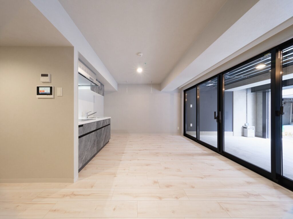 建物の1階住戸には、バイク向けのガレージ付き住戸を設置しています。想定ペルソナがバイク愛好家なので、ガレージ内のインテリアは黒を基調とした武骨かつミニマルなデザインとしています。加えて、ガレージとの境は大きなガラス壁で居室側から眺められるような設えとしており、バイクだけでなく陳列や作業を伴う多様な趣味に合わせたスペースとして活用していただくことが可能です。最上階は、各住戸専用の屋外スペースに専用の水栓や照明、ウッドデッキスペースを設け、野外活動の場所として専用して使用出来ます。