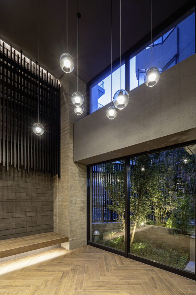 本物件は、東急田園都市線「三軒茶屋」駅と「駒沢大学」駅から各徒歩約10分の距離にあります。周辺には、24時間営業のスーパーや飲食店、ジムなどがそろう一方、昔ながらの商店と、カフェや雑貨店・ライブハウスなど新旧のカルチャーが共存。さらに、渋谷や二子玉川へも電車で5分なので、都心へのアクセスやショッピング、レジャーにも便利で魅力的なエリアです。 大通りに正対した外観は、石の積層を感じさせるモノクロでミニマルに、エントランスホールも同様の質感で2層分吹き抜けとし、雑踏の中でもクールでモダンな印象のアプローチになっています。
