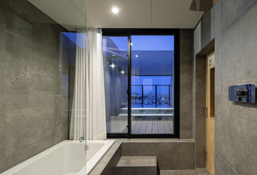 さらに、最上階にはメゾネット構造のプレミアム住戸を2室設け、サウナ・露天風呂付きのテラスを専用に完備。圧倒的な眺望を楽しみながら露天風呂に入ったり、サウナの後の水風呂やととのうスペースとしてテラスを使ったりする事が可能で、自宅に居ながら気軽にリラクゼーションを体験することができます。