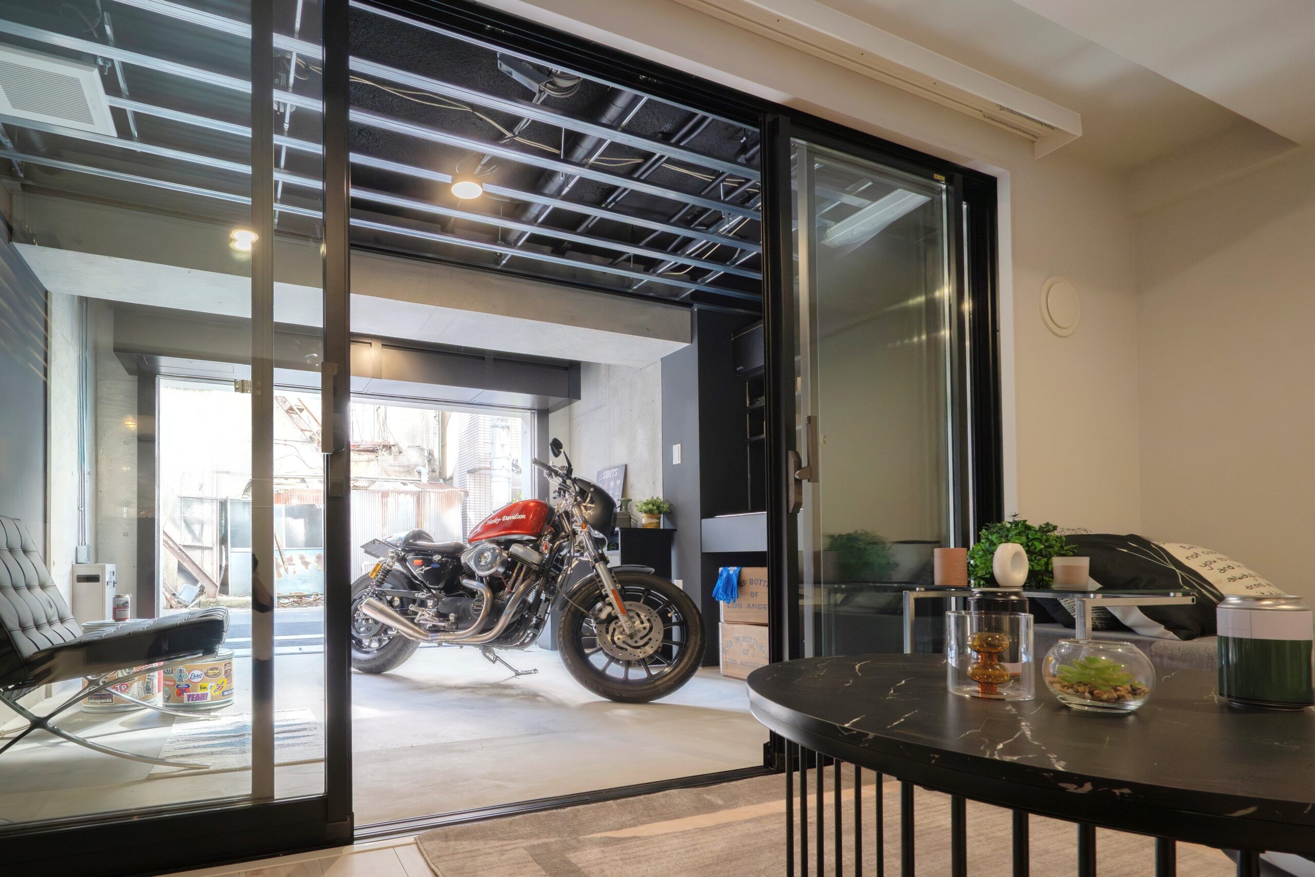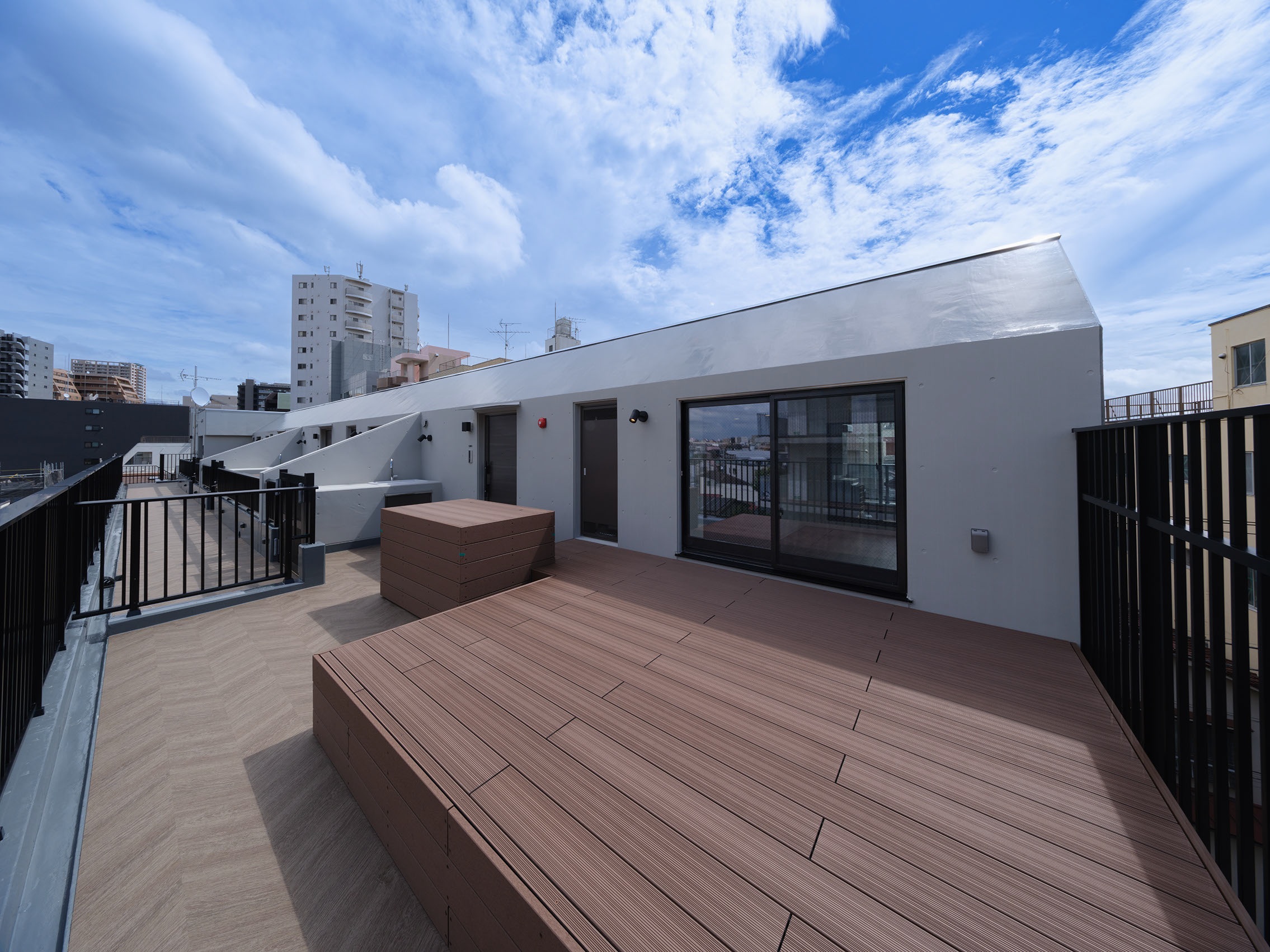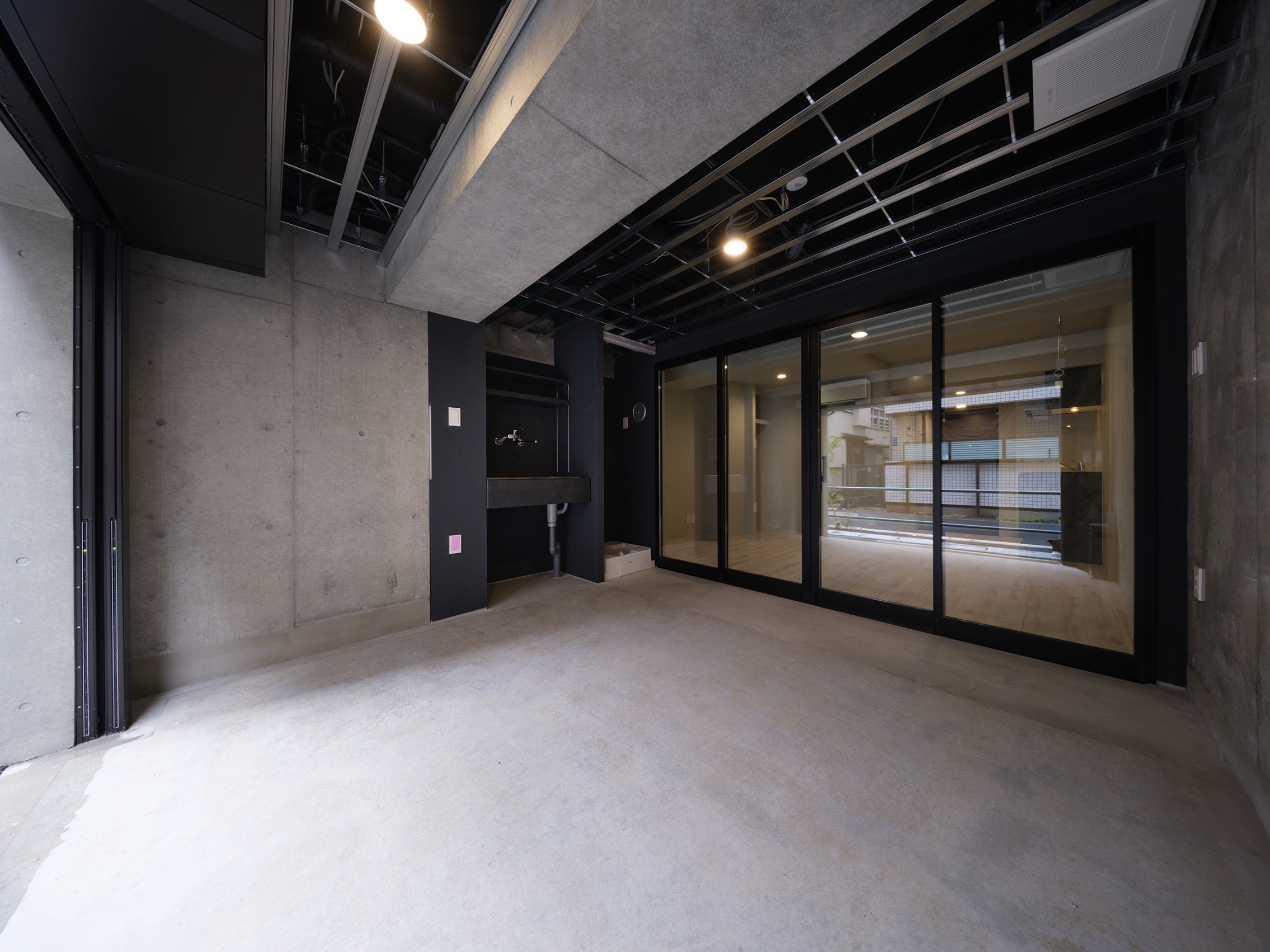建物の1階住戸には、バイク向けのガレージ付き住戸を設置しています。想定ペルソナがバイク愛好家なので、ガレージ内のインテリアは黒を基調とした武骨かつミニマルなデザインとしています。加えて、ガレージとの境は大きなガラス壁で居室側から眺められるような設えとしており、バイクだけでなく陳列や作業を伴う多様な趣味に合わせたスペースとして活用していただくことが可能です。最上階は、各住戸専用の屋外スペースに専用の水栓や照明、ウッドデッキスペースを設け、野外活動の場所として専用して使用出来ます。